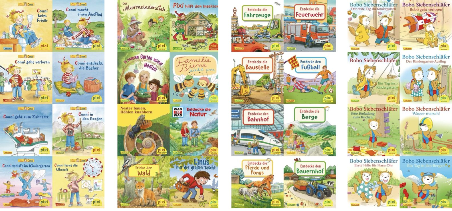 I recommend buying these new, because they are inexpensive and when buying used the sets often get broken up and sold for more than they are worth. You can find them with this keyword: “Pixi-8er”. Some top recommended sets available on Amazon.com: Leo Lausemaus, Entdecke die Welt, Was ist Was, Conni, Fahrzeuge auf der Baustelle (an all-time favorite that includes three of our favorite books: Riko Retter der Straße, the only German book I am aware of that features a Black father as the main character, the adorable rhyming story Klaus baut ein Haus, and a whimsical Willi baut, about an enterprising beaver who builds a skyscraper for mice).