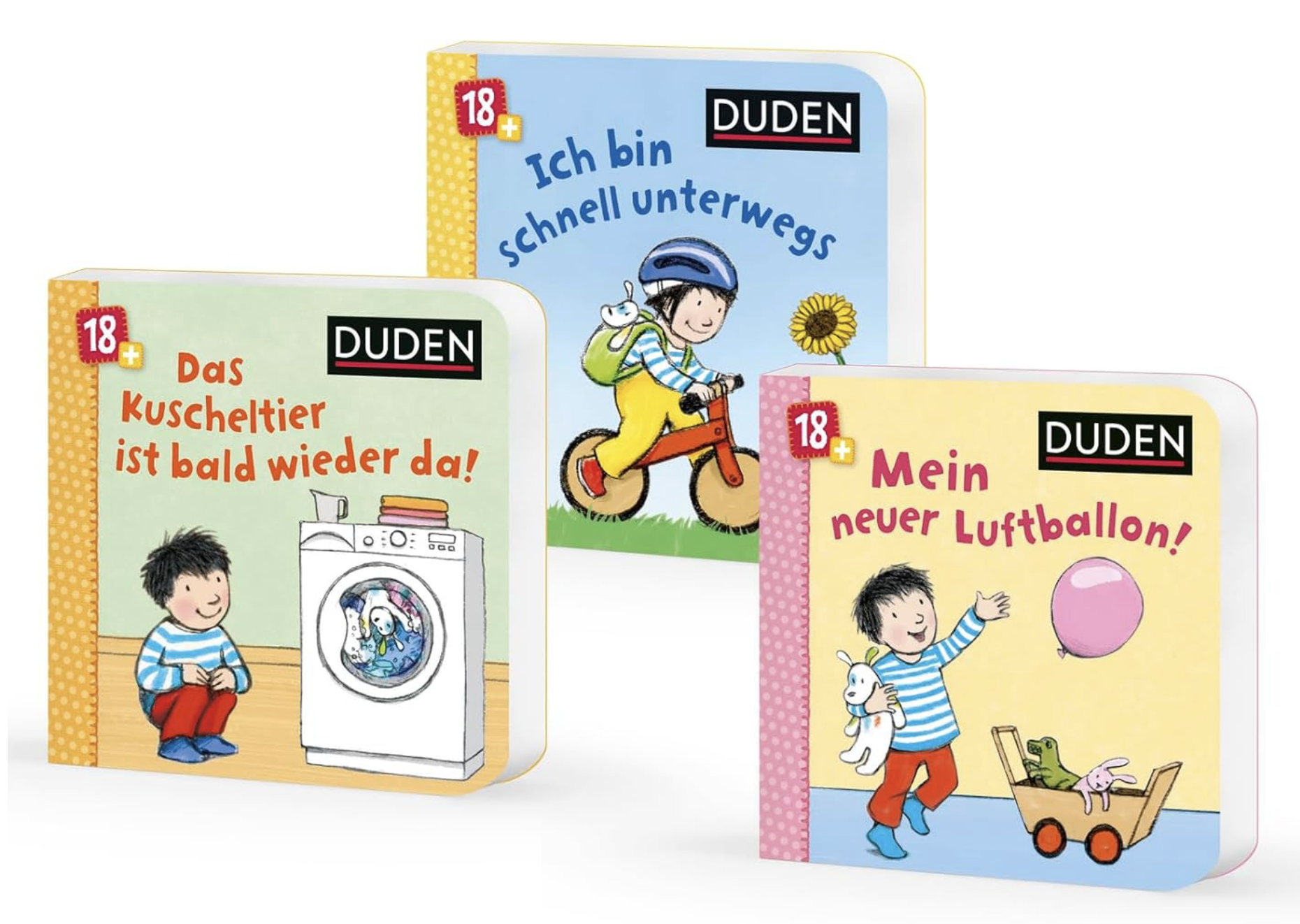 Katharina Bußhoff’s Mika series is a must for 18-36 months. The stories are about a young toddler boy named Mika and his everyday life. They are truly funny and very simple, perfect for toddlers just starting to engage with books. The series is available in two formats, a large board book with multiple images on a single page (Duden 24+: Guck mal, was ich kann! Allererste Geschichten für jeden Tag: Allererstes Vorlesen) and two 6-book sets of small board books (Duden 18+: Meine kleine bunte Kinderwelt, and Duden 18+: Mein kleiner Trost- und- Mutmach- Würfel). If you have the choice, I’d purchase the small board books, which offer a better reading experience for toddlers due to the size and sequential arrangement of the images.