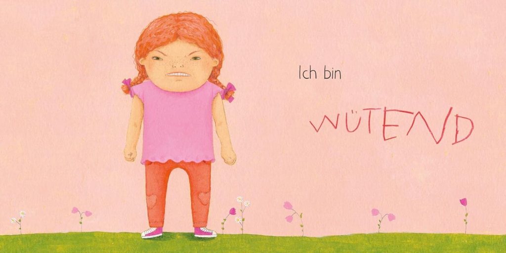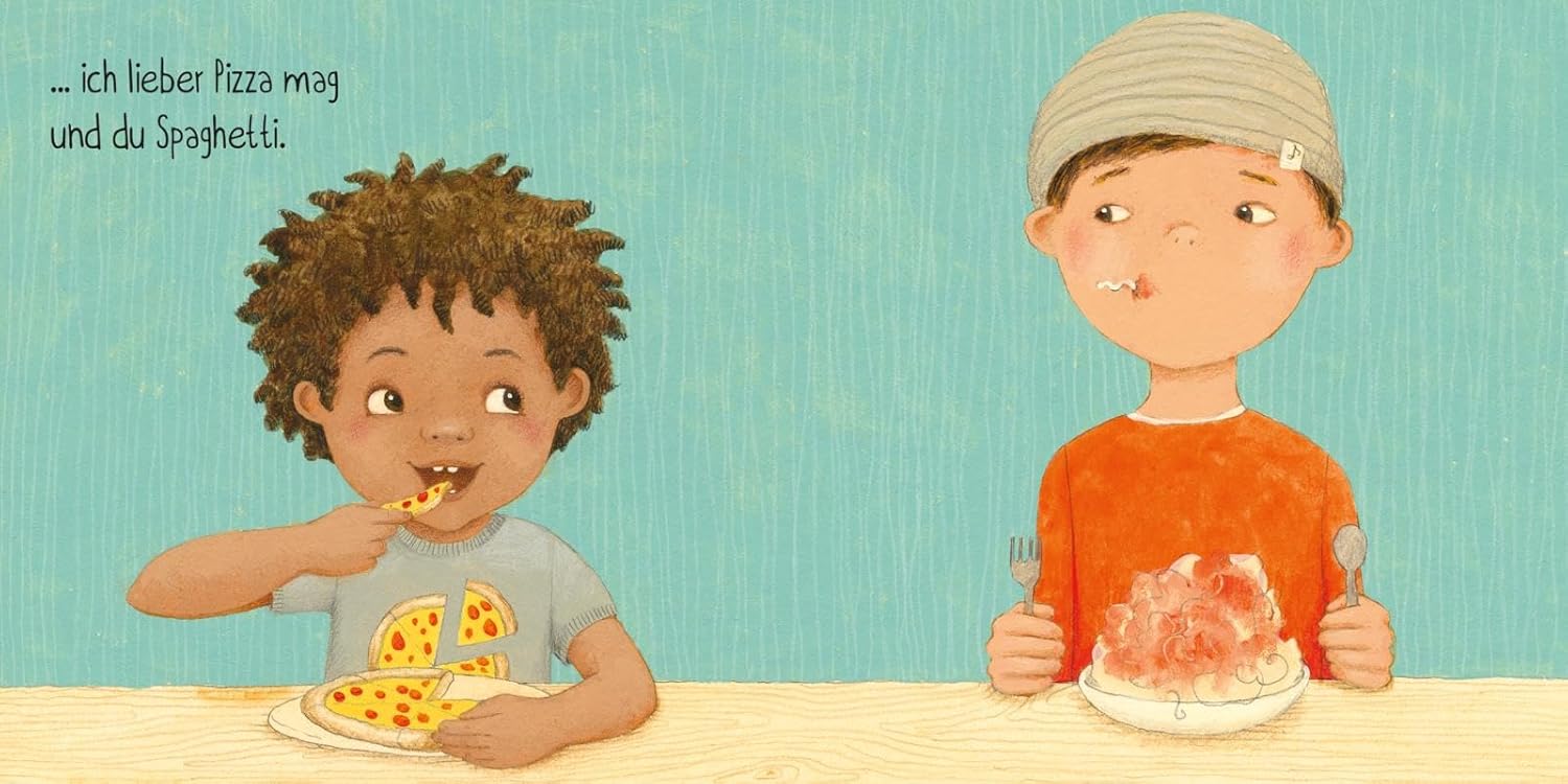 In Ich mag… we learn about their favorite things, and in Ich bin jetzt… we learn about emotions they are feeling. In Ich bin anders als du – Ich bin wie du we learn about the similarities and differences between the children and their families. All three of these books have a nice rhythm and a bit of suspense, as von Kitzing splits each sentence across multiple pages. There is often a surprise or a joke in the second half as the children think or do something unexpected.